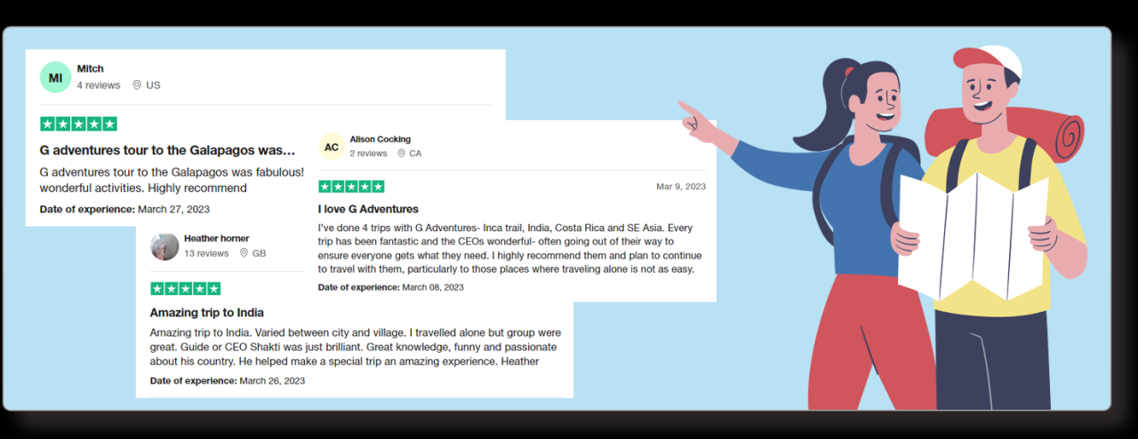 - Positive reviews highlighting exceptional customer service, unique experiences, and responsible travel practices can enhance G Adventures' brand image. They attract more travelers looking for trustworthy and high-quality travel options.